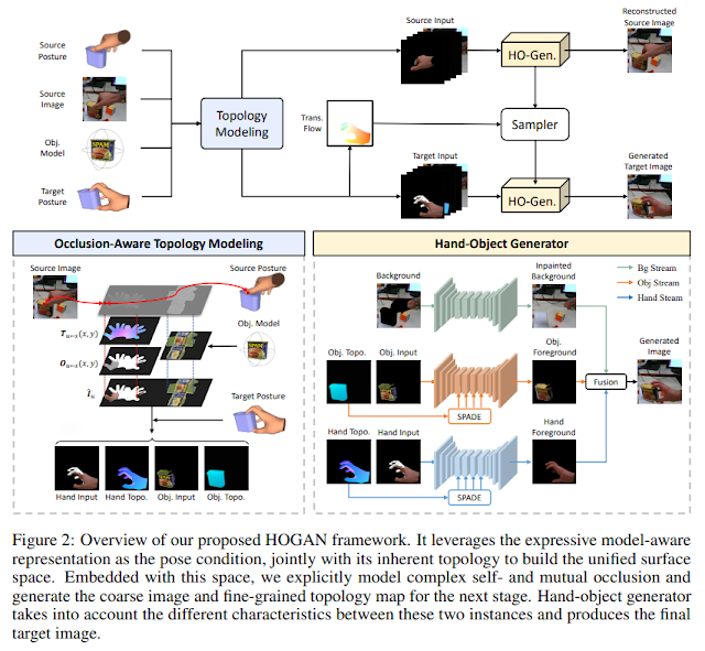 こちらの論文は上の図にあるように、物体を把持している画像を入力とし、Targetとなる手と物体の姿勢にあった画像を出力する手法となっている。指定した手の姿勢にあった手画像を生成する手法はこれまでに提案されていたが、このように物体と手のインタラクションを考慮した把持画像生成については、こちらの論文が初めての取り組みとなっている。